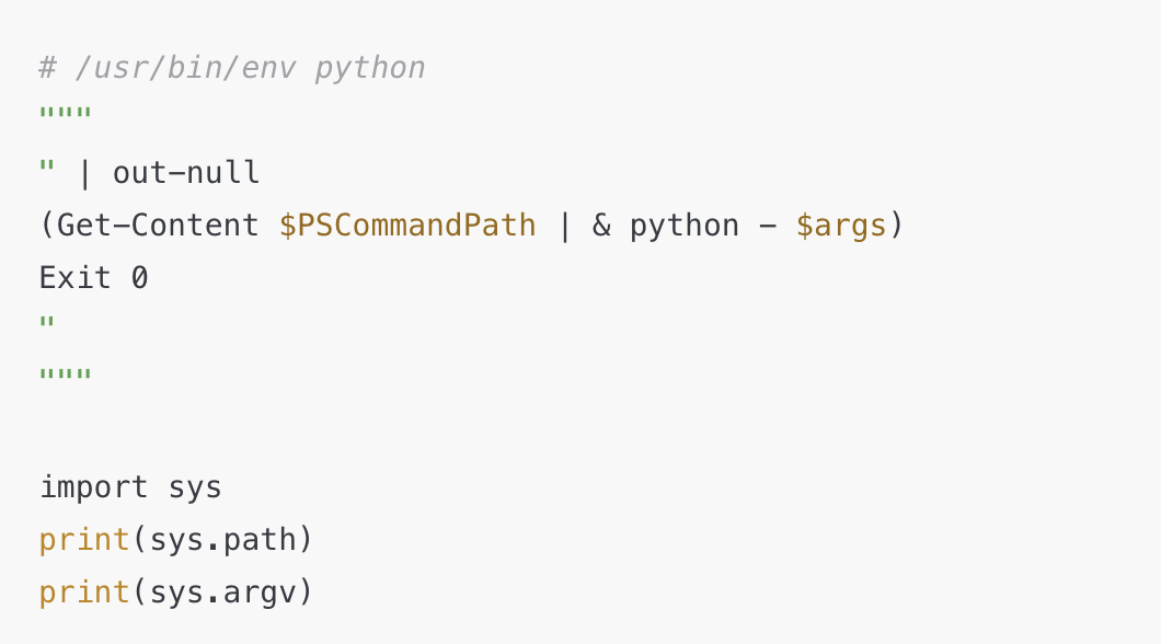 # /usr/bin/env python """ " | out-null (Get-Content $PSCommandPath | & python - $args) Exit 0 " """ import sys print(sys.path) print(sys.argv)한가지 문제점이라면, 편집기의 syntax 가 python이 아닌 powershell로 잡힌다는거지만, entrypoint만 불러주는 스크립트용으로는 쓸만 할 것이다.